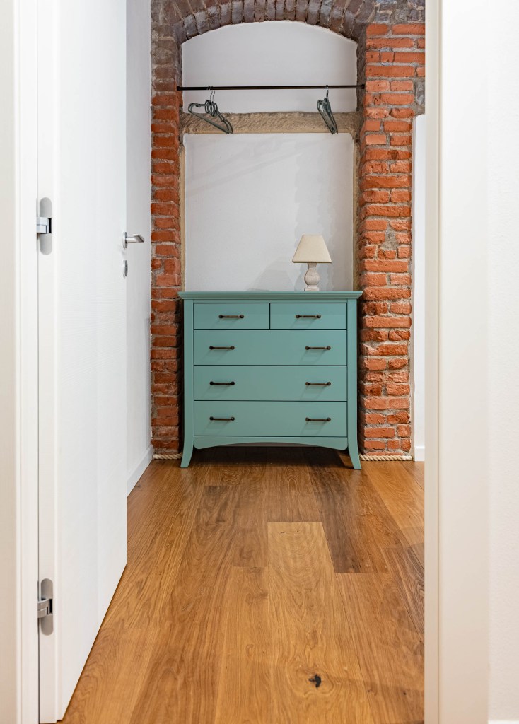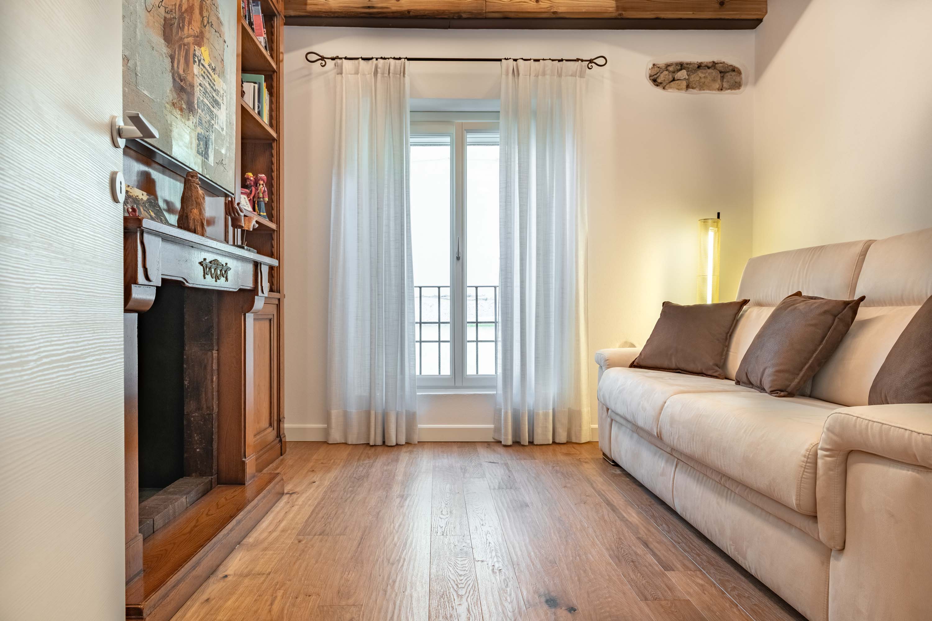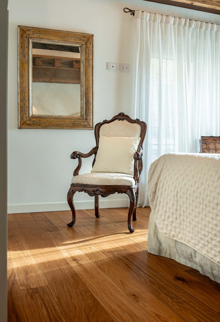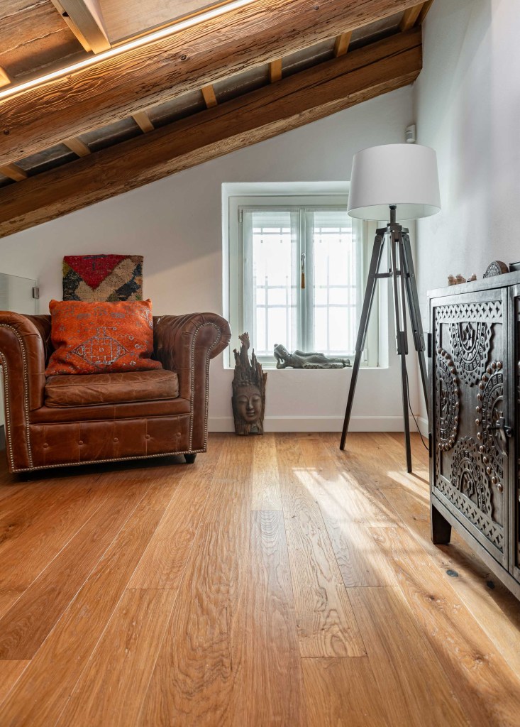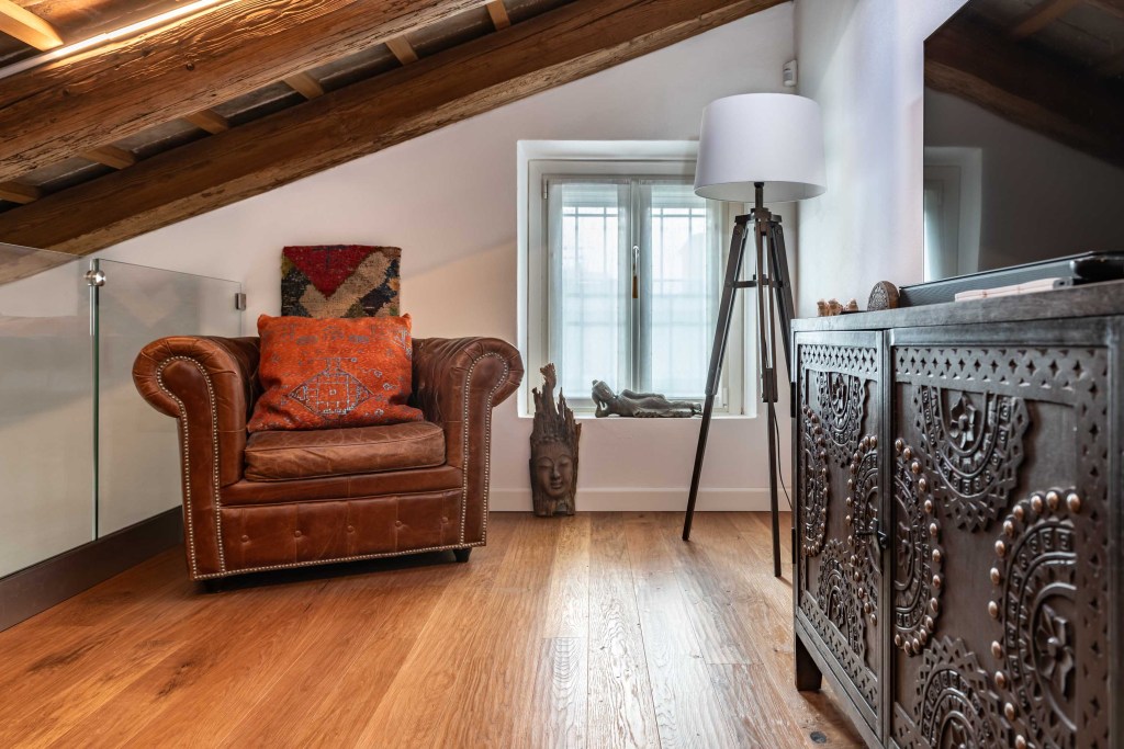 Lo stile è classico: nel soffitto sono presenti antichi travi a vista che creano un ambiente caldo in abbinata al rovere termotrattato color Brunello.