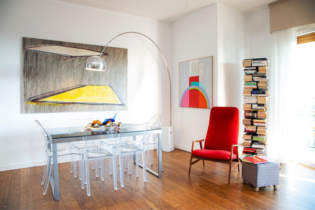 This apartment has been skilfully renovated in a contemporary key playing on the antithesis between the cold tones of the furniture and walls and the warmth of the wooden floor.