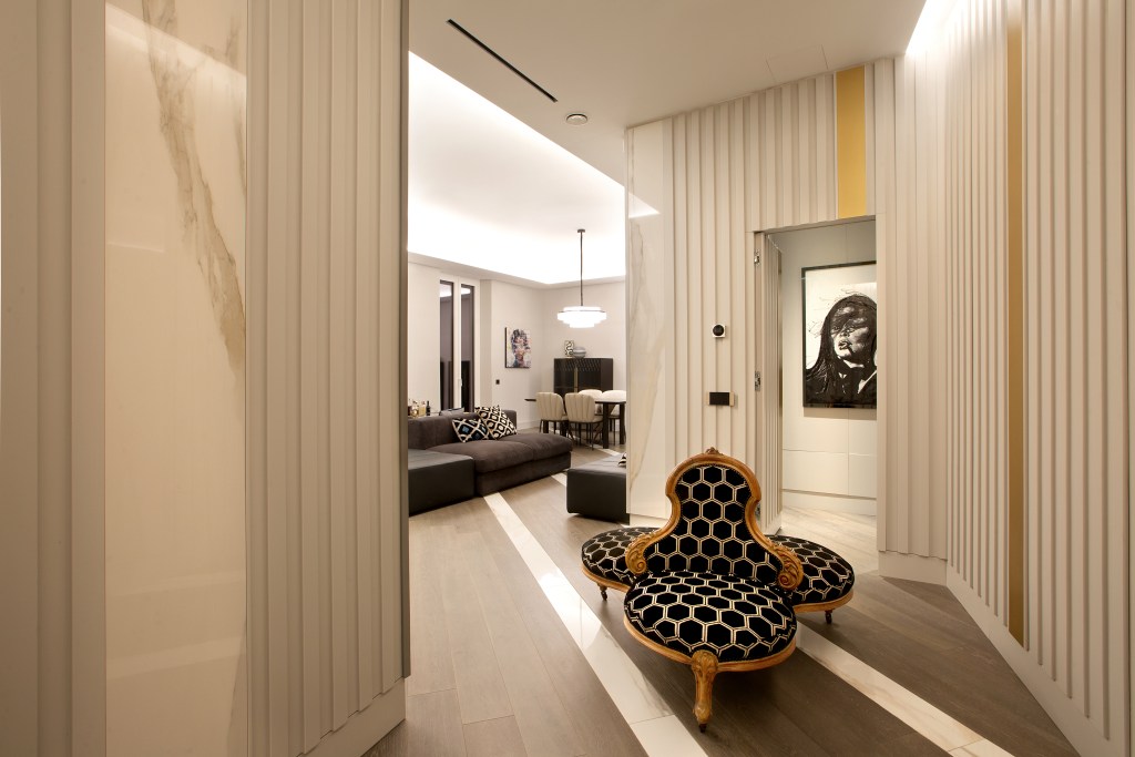 A glamorous and elegant apartment characterized by strong contrasts and refined stylistic choices in shades of gray.