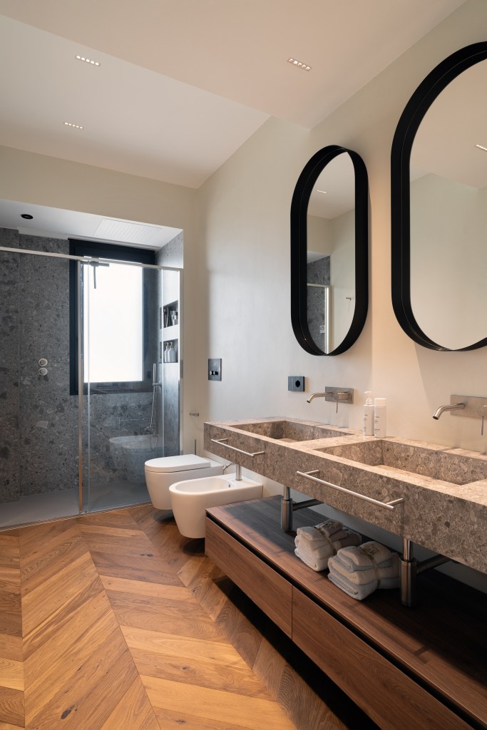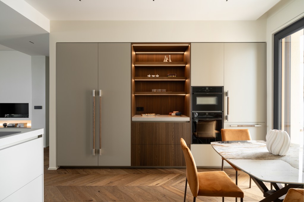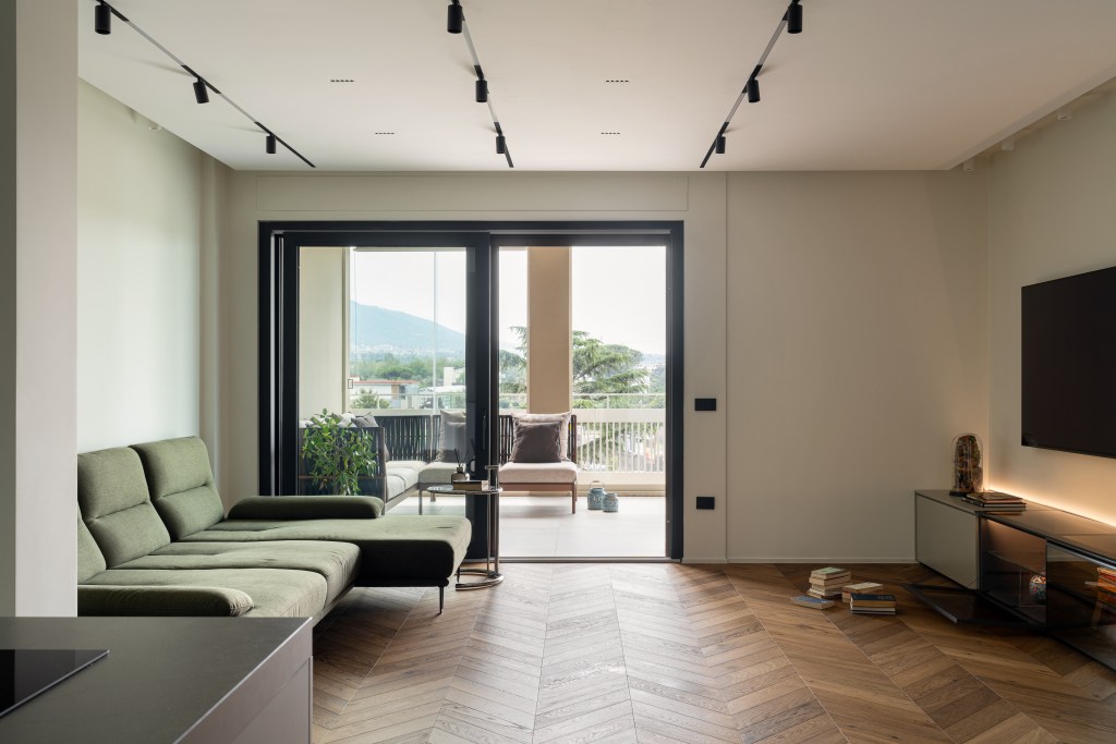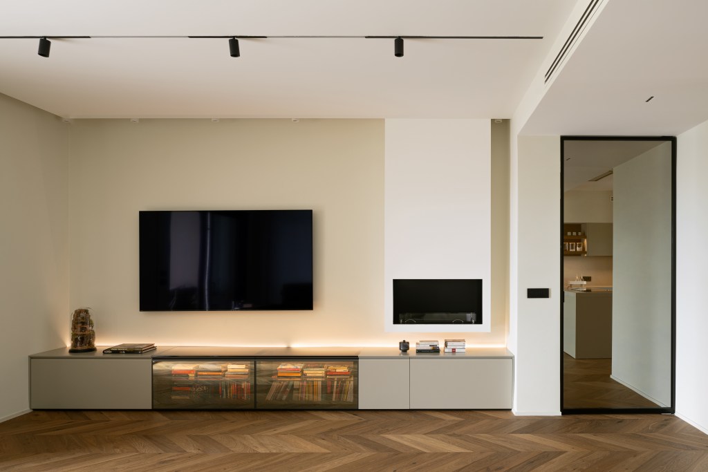The wooden flooring creates a warm and inviting atmosphere throughout the apartment. This choice of natural wood flooring integrates perfectly with the essential, designer furnishings, lending the space a timeless elegance.