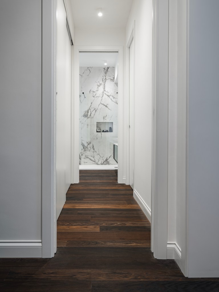 In this refined residential project, the wooden flooring takes center stage in a modern narrative of living. The oak creates a natural carpet with a warm tone that integrates perfectly with the white surfaces and marble finishes.