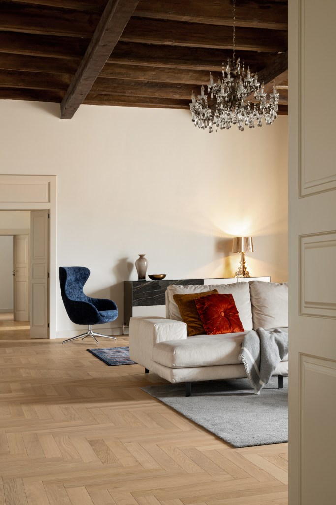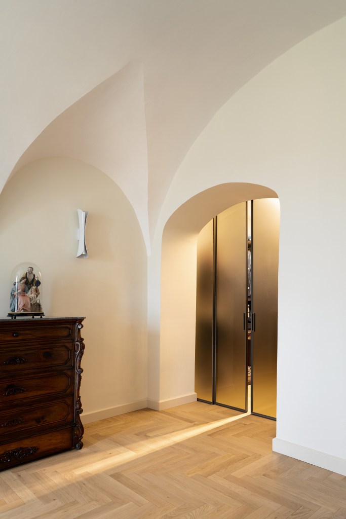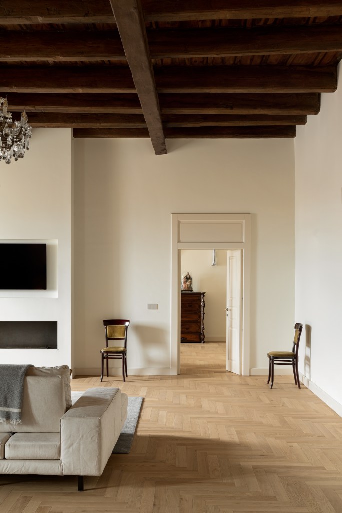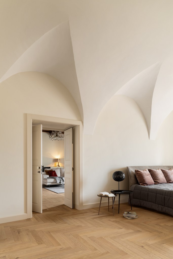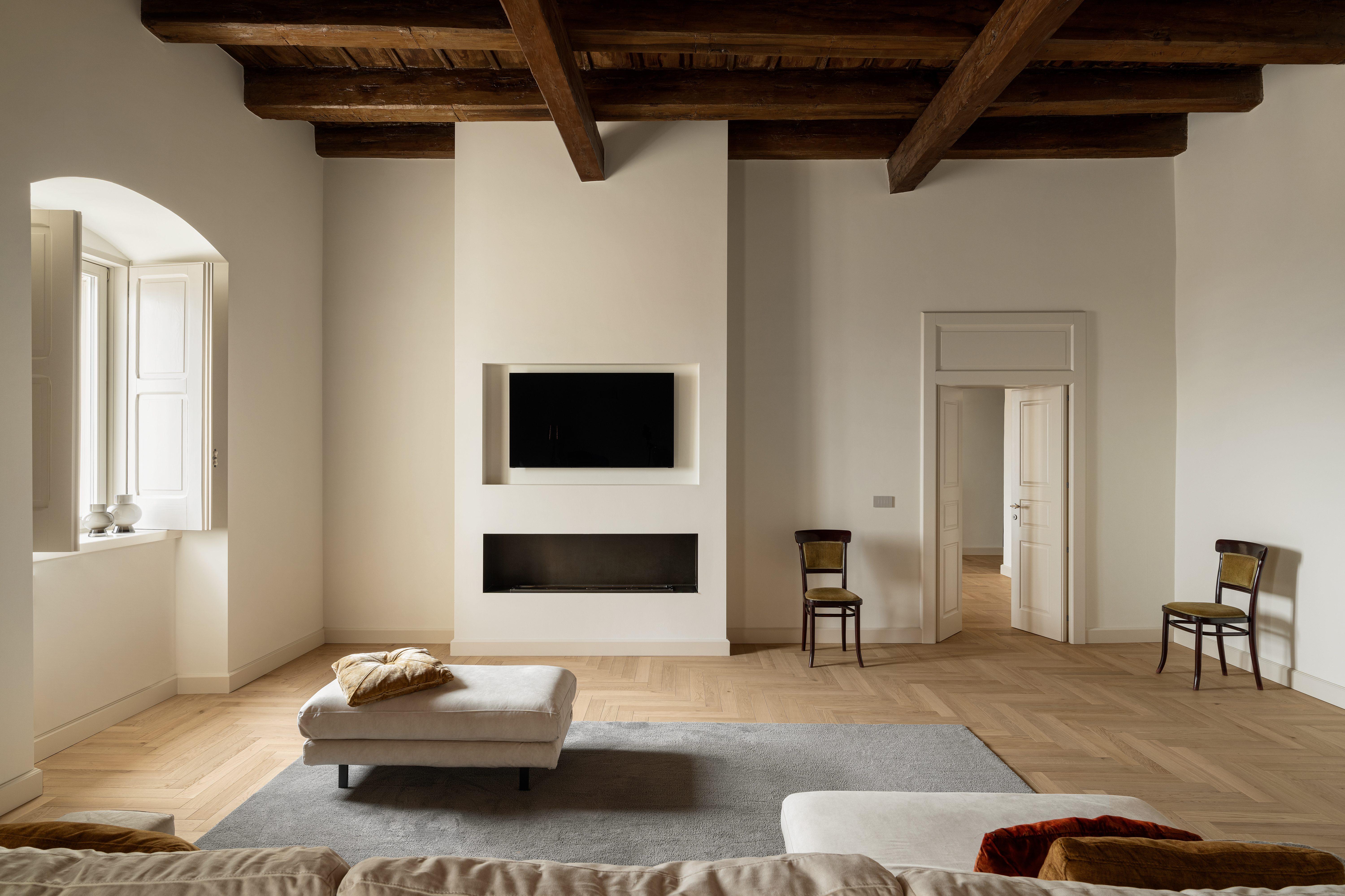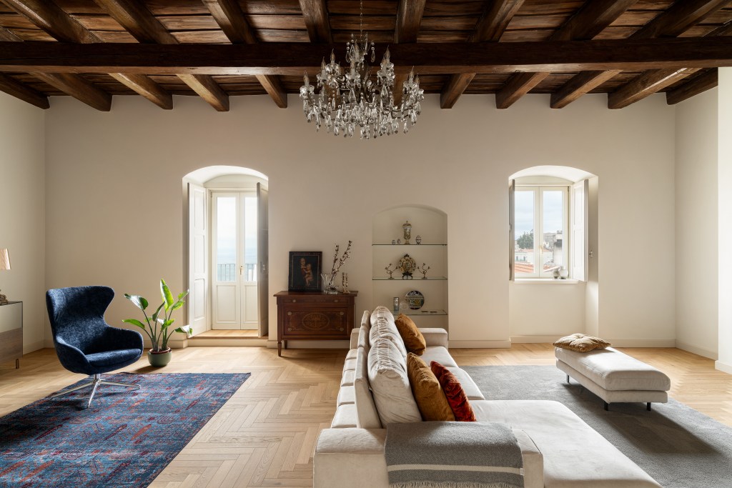 In the heart of a historic palace, the interiors have been restored with a unique sensitivity that combines respect for the past with modern refinement. The high vaulted ceilings and large openings create a bright and welcoming atmosphere.